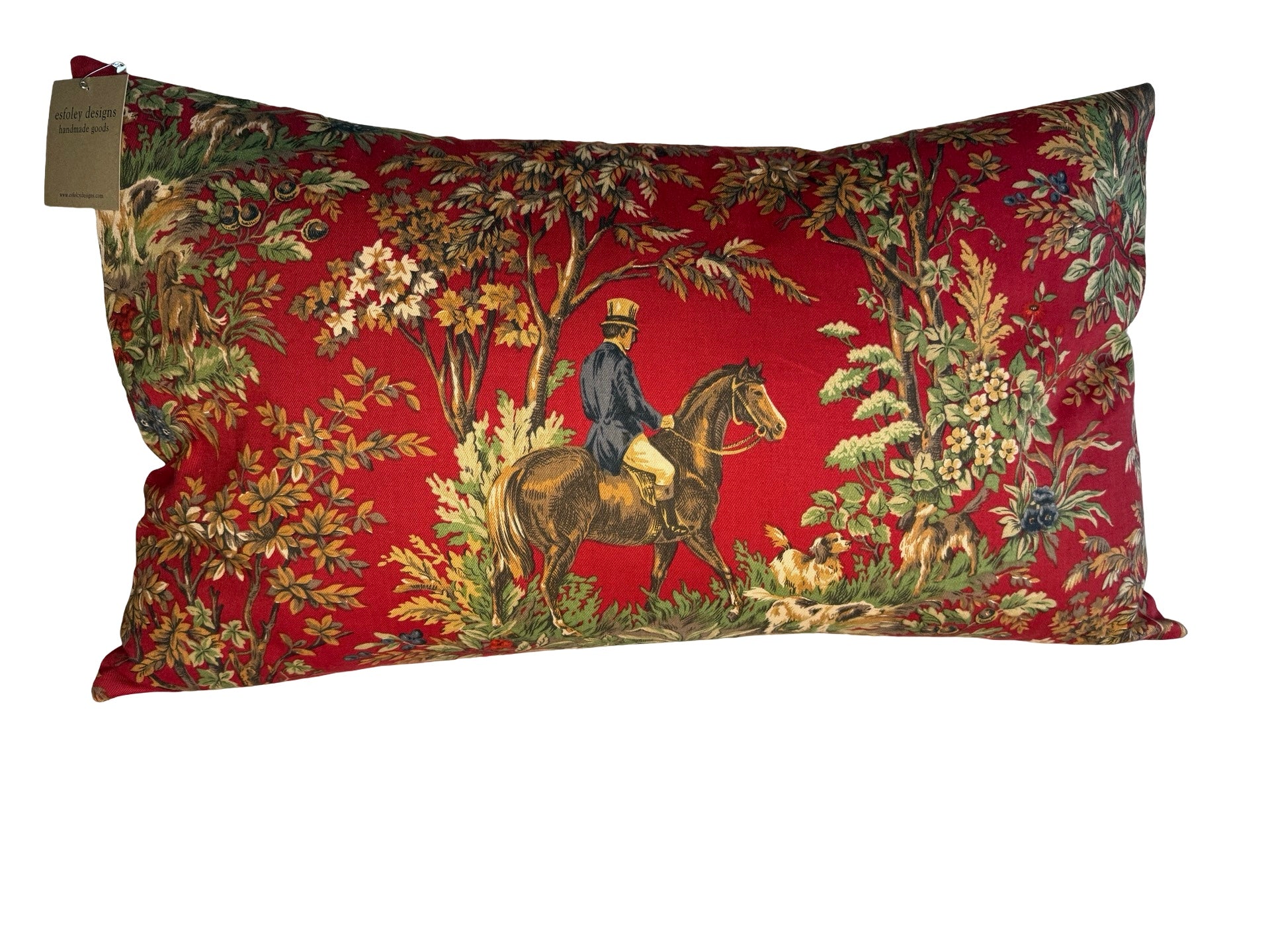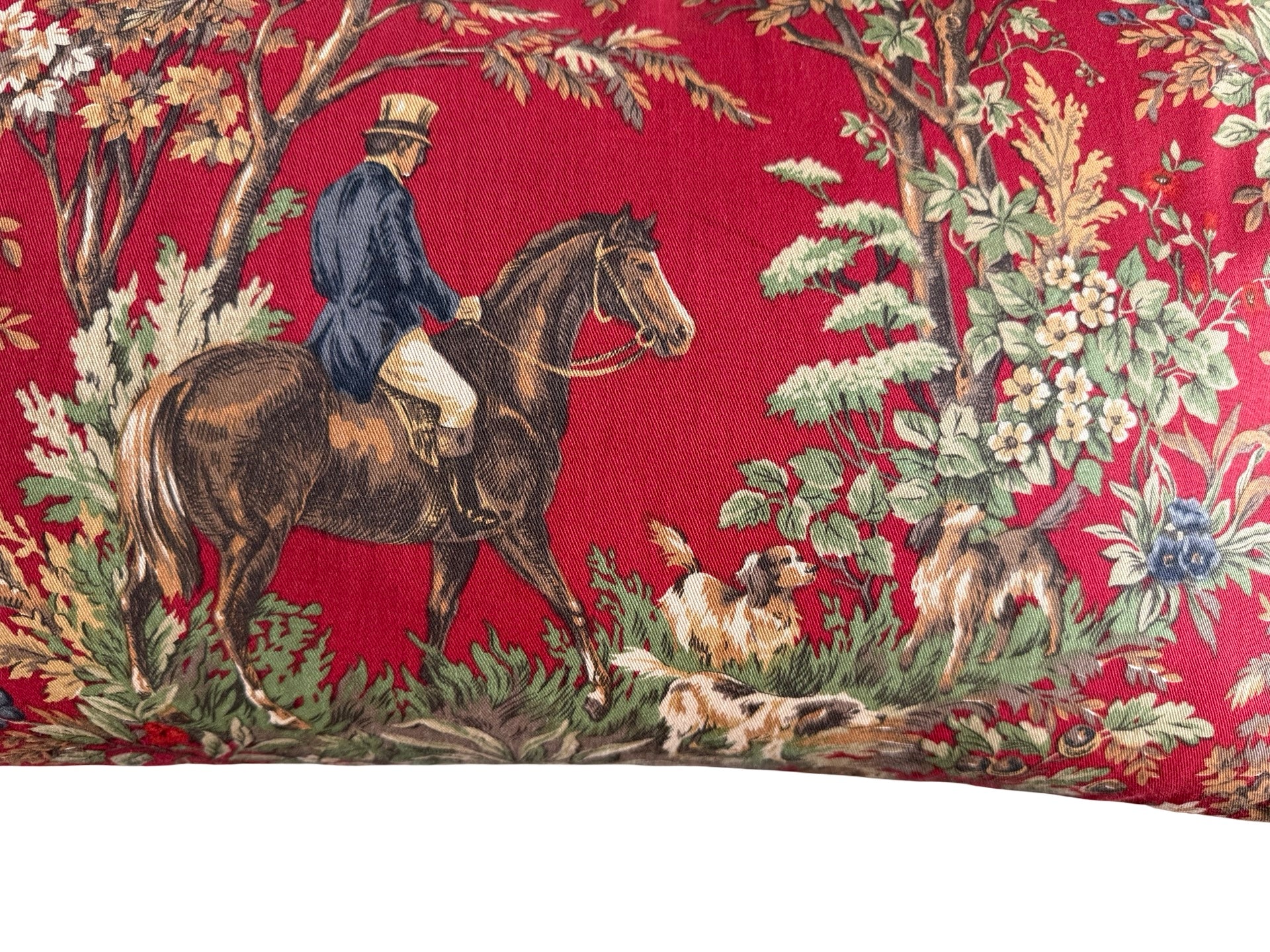 Quintessential Vintage Ralph Lauren Equestrian fabric - AINSWORTH in Canterbury Red, 100% cotton, made into a lush 14 x 24 pillow with 100% feather insert. Back side is a coordinating brown raw silk fabric.