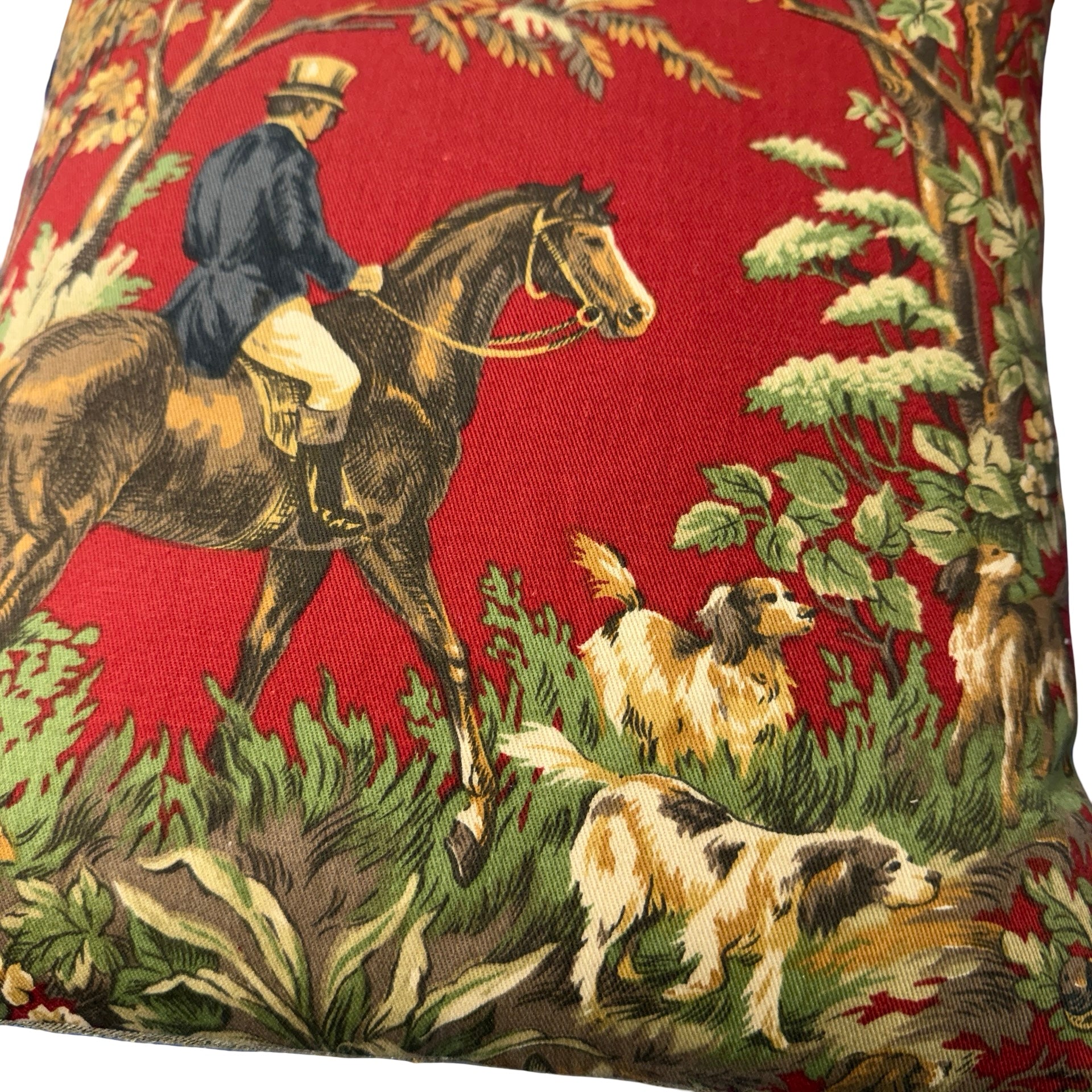 Quintessential Vintage Ralph Lauren Equestrian fabric - AINSWORTH in Canterbury Red, 100% cotton, made into a lush 13” x 13” pillow with 100% feather insert. Back side is a coordinating brown raw silk fabric.